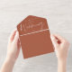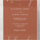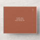 Alles in einer Hochzeitseinladung mit eleganter Typografie auf Terrakotta-Hintergrund. Die Einladung enthält eine perforierte RSVP-Karte mit QR-Code. Entwickelt von Thisisnotme©