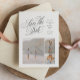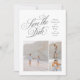 This elegant three-photo wedding save the date features a beautiful "save the date" script type treatment, simple custom text and a collage of one large and two smaller photos. This beautiful save the date design is a great way to share engagement photos and tell family and friends wedding details. The back features an elegant matching black with soft dots along iwth a customizable message and a qr code for your wedding website. This original card by Lea Delaveris Design is available in more styles and colors in the collection and also as a digital save the date download.