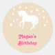 Dieser stilvolle Aufkleber eignet sich ideal für eine Geburtstagsparty mit klassischer Drehung zum Thema Einhorn. Verfügt über die Silhouette eines Einhorns mit Sternen und Punkten herum. Verwenden Sie es für Gastgeschenke, Dekorationen oder zum Siegel Umschläge.
