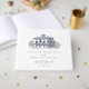 This destination wedding guest book features a vintage illustration of a frigate sailing ship, which you can replace with an image of the wedding venue. Elegant dark blue lettering in serif and script fonts lay out the bride and groom names, and the date.