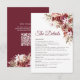 The corner florals include burgundy roses, blush peonies, and eucalyptus leaves, hand-painted in watercolor for a soft, luxurious look. Easily customize each section — ceremony, accommodation, transportation, registry, and dress code — and include your personalized QR code linking guests to your wedding website for more information.