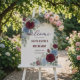 Invite guests to share their favorite wedding memories with an elegant burgundy and dusty blue floral station featuring a scanned QR code for easy upload.This design displays a sophisticated arrangement of watercolor roses in deep burgundy red, dusty blue, and soft blush pink, artistically framing the edges. The visual hierarchy leads the eye from a sweeping, elegant calligraphy headline down to a prominent, high-contrast dark burgundy QR code set against a soft cream background. The layout utilizes a clean serif font for instructions, ensuring high legibility for mobile scanning and accessibility for guests. Please note: This is a flat printed image with a watercolor effect, not actual raised material.