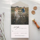 Elegant all in one photo wedding invitation featuring white calligraphy script and serif typography overlaid on a full-bleed engagement photo, with event details flowing beneath in a refined typographic layout. Includes a detachable RSVP postcard with a simple guest count response for easy reply — no meal selections needed. The back can be individually personalized with each guest's name and address for direct mailing, and the return address appears on both the back flap and RSVP panel. No envelope required. All text, colors, and layout are fully editable.