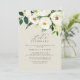 Dieses elegante, weiße, blumengeschmückte Champagner lädt zu einer klassischen Verlobungsfeier, einer Hochzeit nach dem Party, einer Pension, einem Abschluss oder einem anderen Happy Event ein. Das moderne Vintage Design besticht durch eine wunderbar romantische Elfenbein- und Cremefarben-Rose und Blume mit dunkelgrünen Blätter, Grünpflanzen und Botanicalen.