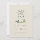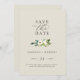 Diese elegante, weiße Champagner-Ankündigung Datum freihalten ist ideal für eine klassische Hochzeit. Das moderne Vintage Design besticht durch eine wunderbar romantische Elfenbein- und Cremefarben-Rose und Blume mit dunkelgrünen Blätter, Grünpflanzen und Botanicalen.