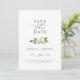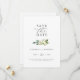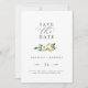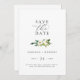 Diese elegante weiße Ankündigung Datum freihalten ist perfekt für eine klassische Hochzeit. Das moderne Vintage Design besticht durch eine wunderbar romantische Elfenbein- und Cremefarben-Rose und Blume mit dunkelgrünen Blätter, Grünpflanzen und Botanicalen.