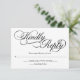 Eine formelle, elegante weiße Hochzeit RSVP mit schwarzer Kalligraphie-Skript.