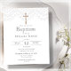 Individuell anpassbares, erschwingliches Papier, Taufen Einladungen, mit einem Spitzenprint und goldenem Tonkruzifix auf einem sauberen weißen Hintergrund.