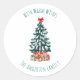 Send warm holiday wishes with this beautifully designed Christmas sticker featuring a classic snow-covered Christmas tree adorned with a red bow and surrounded by festive wrapped gifts. Perfect for spreading joy and cheer this holiday season, this round sticker blends elegant watercolor artistry with timeless holiday charm. Personalize it with custom text at the top and the bottom.
