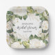 Bridal shower square paper plates feature white roses, green and gold leaves with your details in chic lettering. MATCHING items in our collection.