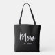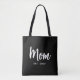 Elegant White Script Established New Mom Black Tote Bag... Are you a new mother yourself or are you looking for a thoughtful Mother's Day gift idea for a new mom? Here is a fun customized white on black tote bag spelling out "Mom" in elegant white script typography with classic serif text just underneath displaying "Est. 2025" as the birth year. All example text can be easily revised on the personalization template.