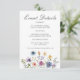 Pretty wildflowers decorate the bottom of this colorful spring wedding event details card. Watercolor floral borders are perfect for a garden ceremony outdoors while flowers are in bloom. Elegant script dances above a beautiful orange, purple, yellow, and blue botanical meadow.