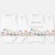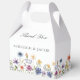 Pretty wildflowers decorate the bottom of this colorful spring wedding favor box. Watercolor floral borders are perfect for a garden ceremony outdoors while flowers are in bloom. Elegant script dances above a beautiful orange, purple, yellow, and blue botanical meadow on these custom boxes.