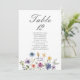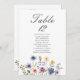 Pretty wildflowers decorate the bottom of this colorful spring wedding table number card with guest names. Watercolor floral borders are perfect for a garden ceremony outdoors while flowers are in bloom. Elegant script dances above a beautiful orange, purple, yellow, and blue botanical meadow on this personalized decor.