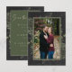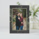 Introducing our enchanting winter wedding photo save the date card, where timeless elegance meets the beauty of the season. The rich charcoal black background, softly distressed with white accents, sets a captivating tone for your special day. In the dark sage green text area, your wedding details stand out, surrounded by a delicate cream frame that adds a touch of refinement. Embrace the spirit of winter with a breathtaking frame of lush greenery, featuring holly adorned with rich red berries, mistletoe with its delicate white berries, and the timeless allure of green pine. Created by Simply Farmhouse Press.