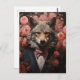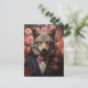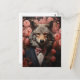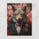 Ein eleganter Wolf in einem Anzug mit rosa Blume, die in den jeden Anlässen die Karte grüßen