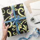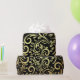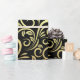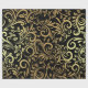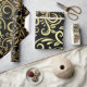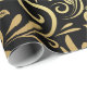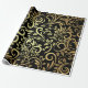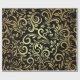 Elegant wrapping paper with a black background and intricate gold floral swirl patterns. The sheet is partially unrolled, conveying a luxurious feel.