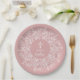 Stylish pink girl baptism paper plates feature a white cross surrounded by a wreath of white leaves and your details in chic lettering. MATCHING items available in our collection.
