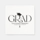 Feiern Sie Ihren Absolventen mit raffiniertem, modernen Stil mit diesen eleganten Abschluss-Partyservietten. Vor einem schicken weißen Hintergrund zeigt das Design das Wort „GRAD“ in einer modernen Serifenschrift, wobei ein stilvolles Abschlussmützensymbol über dem „R“ positioniert ist. Das Ende des „R“ fließt nahtlos in eine baumelnde Quaste, die durch den Namen des Absolventen, die Schule und das Abschlussjahr verläuft, für ein zusammenhängendes, hochwertiges Aussehen.