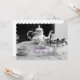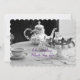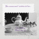 Individuell gestaltete Hochzeitseinladungskarte mit elegantem, antikem Tee-Set vorne und persönlicher Note auf der Rückseite.