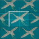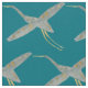 Eleganter aquamariner Stoff, bedruckt mit einem sich wiederholenden Muster von Kranvögeln in Grautönen und Senfgelb, inspiriert durch traditionelle japanische Kunst oder Chinoiserie Stil. Ideal, um Ihrer Wohngestaltung eine farbenfrohe Touch hinzuzufügen.