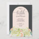 Die Brautduscheinladungen sind in schicken Buchstaben auf einem hellrosa gewölbten Einlauf auf einem dunklen Hintergrund mit wunderschönen Aquarellfarben-Blume - weiße und grüne Hydrangeas, rosa und cremefarbene Rose, Gänse, kleine Stiele und Blätter. PASSENDE Artikel in unserem Geschäft.