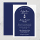 Set segelt auf Ihrer Liebe mit unserer exquisiten Elegant Navy Blue Nautical Wedding Einladung. Dieses Design ist perfekt für Paare konzipiert, die von einer Feier am Meer träumen und verkörpert die Eleganz und das Abenteuer eines nautischen Themas. Mit einer blauen und knalligen weißen Farbpalette und einem Ankermotiv.