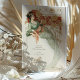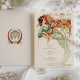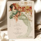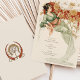 Genießen Sie Ihre Hochzeit mit dieser eleganten, im Jugendstil inspirierten Getränkekarte. Die Vorderseite zeigt eine faszinierende Abbildung einer geposierten Frau in einem fließenden grünen Gewand mit sanften pfirsichfarbenen Akzenten, Set vor einem Hintergrund von reichen roten und goldenen Blumenmustern. Das Kunstwerk besticht durch zeitlose Eleganz und Charme, die perfekte Ergänzung zu Ihrer Hochzeitsdekoration sind. Die Rückseite ist mit einem edlen botanischen Emblem in Gold und Rot geschmückt, das eine Touch Vintager Eleganz verleiht. Auf dieser Karte finden Sie eine raffinierte Auswahl an Cocktails, Bier, Wein und Spirituosen, die Ihren Gästen ein angenehmes Erlebnis garantieren.