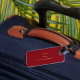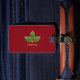 Elegante hellgelbe Blätter auf dem bordeauxroten Gepäckanhänger.