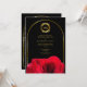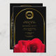 Elegante Schwarz-Rot-Hochzeitseinladung mit luxuriösem schwarzem Hintergrund, edler Goldtypografie und einem beeindruckenden Akzent auf der rote Rose. Das Design wird durch einen goldenen Bogen-Rahmen und einen Lorbeerkranz-Kranz ergänzt, der die Initialen des Ehepaares zeigt und eine Touch von Eleganz und Personalisierung verleiht. Ideal für feierliche Hochzeiten, Hochzeiten oder Hochzeiten in Schwarz-Krawatte, ist diese Einladung mit Ihren Namen, Hochzeitsdetails, Fotos und Monogramm vollständig anpassbar.