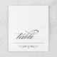 Elegante gefaltete Escort-Platzkarte in Weiß (Hintergrundfarbe kann angepasst werden) und Schwarz. Enthält Kalligraphieskriptschrift und Bildlaufdesign-Akzent.