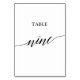 Dieser elegante schwarze Kalligraphie-Tisch mit neun Tischnummern eignet sich perfekt für eine einfache Hochzeit. Das neutrale Design besticht durch eine minimalistische Karte, die mit romantischer und skurriler Typografie dekoriert ist. Die Karte druckt auf der Vorder- und Rückseite (beidseitig). Andere Tischnummern in der Sammlung werden separat verkauft.