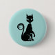 Elegante schwarze Katze posiert mit einer Pfote erhöht. Hat einen niedlichen, lockigen Schwanz und trägt einen extravaganten Scherz.