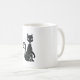Elegante schwarze Katze posiert mit einer Pfote erhöht. Hat einen niedlichen, lockigen Schwanz und trägt einen extravaganten Scherz.