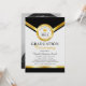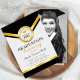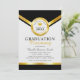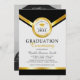 Dieses Abschluss-Einladungs-Design besticht durch eine elegante Formgebung aus Schwarz, Hellgrau und Gold mit einem goldenen Hut aus Abschluss und goldenen Sternen. Personalisieren Sie Ihr eigenes Abschluss im Hintergrund der Einladung.
