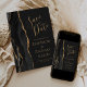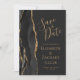 Der links Rand dieses eleganten, modernen Hochzeitsgeschehens bewahrt die Dattelkarte mit einem schwarzen Aquarellrahmen in Aquarellfarbe, der mit Imitaten mit goldenem Glitzer bestickt ist. Der anpassbare Text kombiniert goldfarbene Handschrift, Copperplate und kursiv Schriftart auf einem schwarzen Hintergrund. Die Rückseite ist schwarz, schwarz und schwarz.