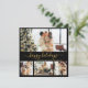 Elegante Kalligrafie Minimalistisch Black und Gold 4 Foto Collage Frohe Weihnachts Script Holiday Card. Dieses festliche, mimimalistische, whimsical vier (4) Foto-Urlaubskarte-Template verfügt über eine hübsche Foto-Collage und sagt "Happy Holidays"! Der Begrüßungstext "Happy Holidays" ist in einem schönen, handgeschriebenen Wirblen Swash-Schwanz Schriftart-Typ geschrieben. Auf der Rückseite mit einem Grußtext mit einem kleinen Herzdoodle auf Weiß und einer horizontalen Bildvorlage. Hübsche Grußkarte für Ihre Familie und Freunde in der Weihnachtszeit.