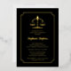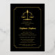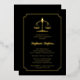 Eine Bibliotheka rechtliche Waage der Gerechtigkeit und skallopierte Rahmen Goldfolie und schwarze Graduierungspartei Einladung Design, die für Recht oder andere rechtliche Feld Schule Abschluss personalisiert sein kann. Composite Design von Holiday Hearts Designs (Rechte vorbehalten).