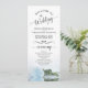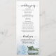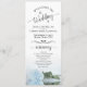 Dieses wunderschöne Hochzeitsprogramm zeichnet sich durch ein elegantes Design aus. Die Rose in blass blassblauem oder pulverblauen Single ist lang gestemmt und spiegelt sich im Wasser wider. Die Titel sind in extravaganter Schrift-Kalligraphie geschrieben, und es gibt Platz für Ihre Zeremonie und Hochzeitsfeier Details, sowie ein kurzes Dankeschön für Ihre Gäste. Ein wunderbarer Weg, um Ihre Freunde und Familie zu Ihrer Hochzeitsfeier zu begrüßen.