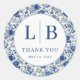 Dieser klassische runde Aufkleber zeigt eine charmante Farbpalette in Blau und Weiß, die an Vintage-Porzellan-Designs erinnert. Die komplizierten Blumenmotive schaffen eine elegante und zeitlose Ästhetik, perfekt, um jeder Oberfläche einen Hauch von Raffinesse zu verleihen. Mit den prominent in einer stilvollen Schriftart dargestellten Initialen "L B" ist dieser Aufkleber ideal, um Geschenke zu personalisieren oder Dankbarkeit mit seiner subtilen "Danke"-Botschaft auszudrücken. Sein klassisches Design macht ihn für verschiedene Anlässe geeignet, von Hochzeiten bis hin zu Babypartys, und verleiht eine vielseitige und herzliche Note.