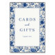 Dieses elegante Tischschild für die Hochzeit verfügt über einen klassischen Blumenrand mit großen blauen Blumen und grünen Blättern, wodurch ein raffinierter Rahmen um den zentralen weißen Bereich entsteht. Das Design umfasst eine kühne Serifenschrift für "Karten und Geschenke" und ein kleineres "Danke", was dem Layout eine formelle Note verleiht. Mit seiner symmetrischen Komposition und der harmonischen Farbpalette aus Blau und Weiß vermittelt dieses Schild Dankbarkeit in einem zeitlosen Stil, der perfekt ist, um die Dekoration Ihrer Hochzeitsfeier zu bereichern.