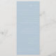 Dieses elegante Hochzeitsmenü verfügt über ein minimalistisches Design mit einem weichen, pastellblauen Hintergrund und weißem Text, wodurch eine ruhige und anspruchsvolle Atmosphäre entsteht. Das Layout ist vertikal ausgerichtet und zentriert, wobei eine Kombination aus Kursiv- und serifenlosen Schriften für eine formelle Note und Klarheit sorgt. Der großzügige Abstand zwischen den Abschnitten hebt jede Kategorie deutlich hervor, während die zurückhaltende Farbpalette und die einfache Typografie Eleganz und Raffinesse betonen. Perfekt für formelle Anlässe konzentriert sich dieses Design auf Lesbarkeit und Ordnung und ist somit ideal für Paare, die eine übersichtliche und dennoch stilvolle Präsentation für ihren besonderen Tag suchen.