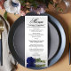 Dieses schöne Menü wird Ihrem Hochzeitsempfang etwas mehr Stil verleihen. Es zeichnet sich durch ein wunderschönes und romantisches Design aus. Die Single-Rose ist in marineblau gehalten und spiegelt sich in einem Wasserbecken mit Wellen und Wellen wider. Es gibt Platz für die Namen des Paares und das Hochzeitstag, und der Text ist vollständig anpassbar.