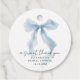 Elegante Partygeschenk-Anhänger für Ihre Brautparty mit einer blauen Koketten-Schleife im Wasserfarben-Stil, einem "süßen Dank" in einer schicken Schrift und dem Namen der Braut und dem Datum der Party in klassischer Serif-Typografie.