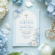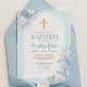 Diese elegante Taufinsel besticht durch eine wunderschöne Mischung aus sanften blauen Blumen und einem goldenen Kreuz, das perfekt dazu geeignet ist, Ihr Baby in den Christlichen Glauben zu empfangen. Die sanfte Aquarellgestaltung, kombiniert mit der formalen Typografie, macht es zu einer idealen Wahl für einen unvergesslichen Baby- oder Mädchentaufen. Passen Sie diese Einladung mit Ihren eigenen Daten an, um einen persönlichen Sake für Freunde und Familie zu schaffen. Ob für eine große Zeremonie oder ein intimes Ereignis, diese Taufeinladung verleiht jedem religiösen Fest Anmut und Schönheit. Ein durchdachtes Design, das Reinheit, Glauben und neue Anfänge vermittelt.