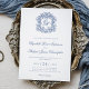 Diese elegante französisch blaue Hochzeitseinladung mit Monogramm enthält ein aufwendiges Wappen mit verschlungenen, verschnörkelten kalligraphischen Initialen der Braut und des Bräutigams sowie deren Namen in klassischem Schwarz und Weiß. Finden Sie passende Produkte in der Kollektion oder senden Sie mir eine Nachricht über den Zazzle-Chat für weitere Produkte und Designanpassungen.