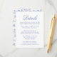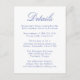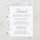 Vervollständigen Sie Ihre Hochzeitssuite mit unserer eleganten Blue Chinoiserie Viktorianische Blumenzettel. Dieses Design zeigt "Details" in einem blauen Kalligraphieskript im Kontrast zu einem weißen Hintergrund. Personalisieren Sie die formelle Hochzeitsdetails mit wichtigen Details wie Ihrem Hochzeitsort, Hotelunterkünften, Anfahrtszeiten und der Hochzeitswebsite. Auf der Rückseite der Karte befindet sich ein blauer, von Chinoiserie inspiriert Blumenmuster.