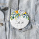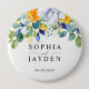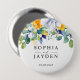 Ein strahlender farbenfroher Hochzeitsknopf mit wunderschönem botanischem Blattwerk in Aquarell und Eukalyptus-Blätter und sonnigen, eleganten, weißen Blume. Feiern Sie Ihren besonderen Tag mit diesem eleganten, blumengelben, weißen und blauen Hochzeitsschalter. Mit seinem charmanten Design mit zarten gelben Blüten, weichen weißen Blumen und subtilen blauen Akzenten strahlt dieser Knopf zeitlose Romantik und Eleganz aus. Die raffinierte Typografie und die Aquarelldetails schaffen eine frische und stilvolle Ästhetik, die sich perfekt für Frühjahr- und Sommerhochzeiten eignet. Ideal für Brautpartys, Hochzeitsgäste oder als wahre Sehnsucht, fügt dieser wunderschön gestaltete Knopf Ihrer Feier eine personalisierte und elegante Touch hinzu, während er ein schönes Erinnerungsstück Ihres besonderen Tages bildet.