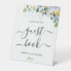 Ein farbenfrohes Gästebuchschild mit wunderschönem botanischem Blattwerk in Aquarell und Eukalyptus-Blätter. Genießen Sie das elegante, gelb, blau und weiß gestaltete Hochzeitsdekor. Dieses elegante Design mit zarten gelben Blüten, sanften weißen Blumen und eleganten blauen Akzenten verleiht diesem Zeichen zeitlosen Charme und Romantik. Die raffinierte Typografie und die luftigen Aquarelldetails schaffen eine frische und stilvolle Ästhetik, die sich perfekt für die Begrüßung der Gäste eignet, wo Sitzgelegenheiten oder wichtige Details hervorgehoben werden. Ideal für Hochzeiten im Frühling und im Sommer, für Gartenfeiern oder für Ausflüge in die Natur. Dieses hübsch gestaltete Schild verleiht Ihrem Tag eine Touch von Eleganz und Eleganz.