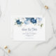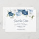 Elegante florale Aquarellfarben staubige blaue, weiße und marineblümte Bouquet Hochzeit speichern die Dattelkarte. Die Karte verfügt über ein Skript "Save the Date", das in einen Schriftart Ihrer Wahl geändert werden kann, der hier verfügbar ist, wenn Sie auf "Personalisieren" klicken.